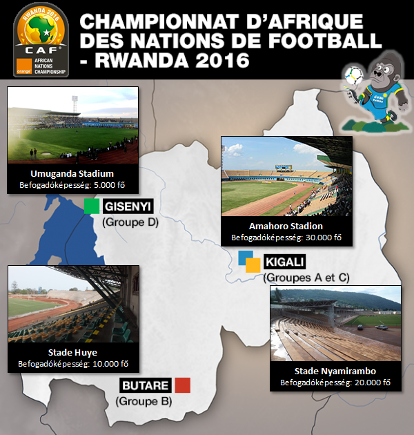 Az afrikai léptékkel mérve kicsiny, 11 millió lakosú ország (három Magyarországnyi területen) három városának négy stadionja ad otthont majd a 2016-os ANB mérkőzéseinek. A milliós fővárosban, Kigaliban a válogatott állandó otthona, a 30 ezer szurkoló befogadására alkalmas Amahoro Stadion mellett a Nyamirambo Stadionban is rendeznek találkozókat, mégpedig a C-csoport meccseit. A tizedakkora Gisenyiben, az északi provincia székhelyén rendezik a D-csoport találkozóit a Kivu-tó partján, míg a déli província alig 70 ezer lakosú székhelyén, Butaréban kerül sor a kiegyensúlyozottnak ígérkező B-csoport összecsapásaira.